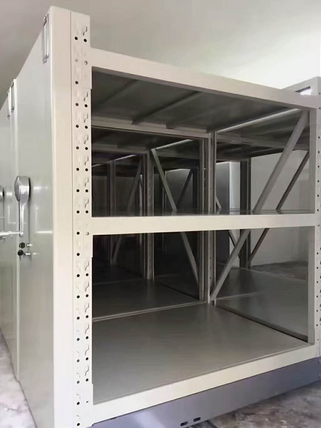 本產品為智能密集型貨架,適用于倉庫、儲物間,因倉庫空間有限所以本產品能更好的利用空間來儲存更多的物品,每組貨架都可使用電動左右調節,省去更多的人力。